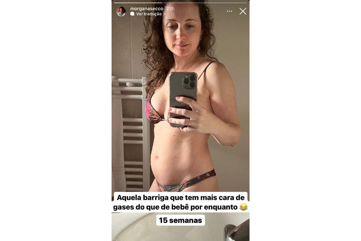 Na imagem, publicada nos stories do Instagram, Morgana aparece de biquíni e posa na frente de um espalho. Na legenda da foto, ela escreveu: “Aquela barriga que tem mais cara de gases do que de bebê por enquanto. 15 semanas”.
