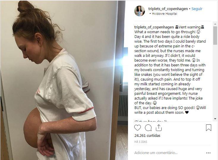Após dar à luz, a mãe fez um novo post com um desabafo mostrando como ficou sua barriga no pós-parto.“O que uma mulher precisa passar! Estou no quarto dia e meu corpo está bem. Nos primeiros dois dias, eu mal conseguia ficar de pé por causa da dor extrema na ferida da cesariana, mas as enfermeiras me fizeram andar um pouco. Se eu não fizesse isso, ficaria ainda pior, foi o que elas me disseram.