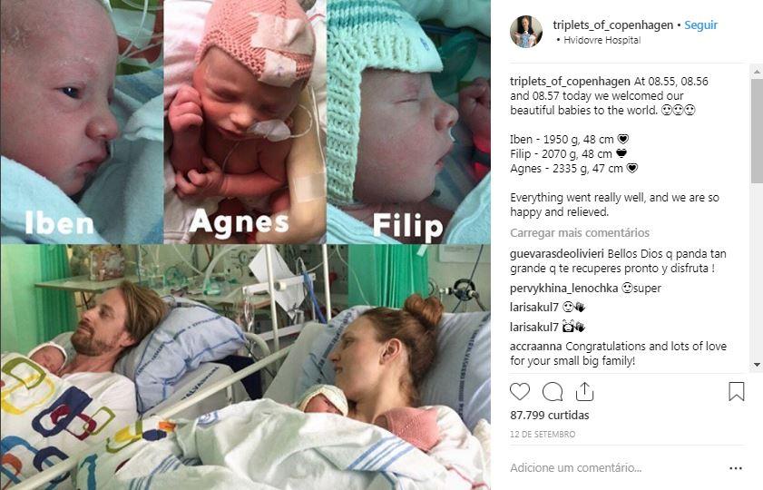 Durante a gravidez, a barriga de Maria chegou a pesar 20 kg. Iben nasceu com 1,950 kg e 48 cm, Filip com 2,070 kg e 48 cm e Agnes com 2,335 kg e 47 cm. “Tudo correu muito bem e estamos tão felizes e aliviados”, escreveu ela, depois do parto.