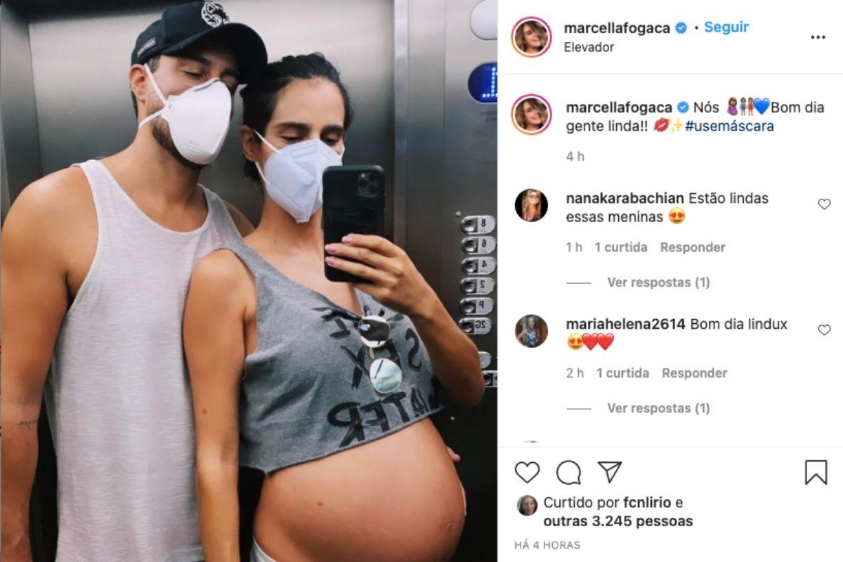 Na manhã desta quarta-feira, 3 de fevereiro, Marcella Fogaça compartilhou uma foto em que aparece no elevador ao lado do marido, o ator Joaquim Lopes. A barriga de grávida de gêmeas chama a atenção.