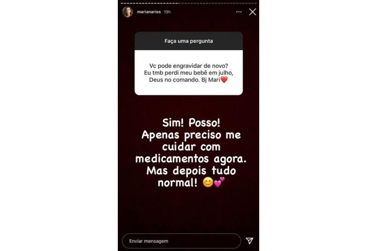 Na última terça-feira, 1 de dezembro, Mariana Rios respondeu, após abrir caixa de perguntas para fãs nas redes sociais, se ela poderá engravidar novamente após aborto causado por doença autoimune. Quando foi questionada por uma seguidora sobre a possibilidade de uma segunda gravidez ela disse que só basta tomar os medicamentos.