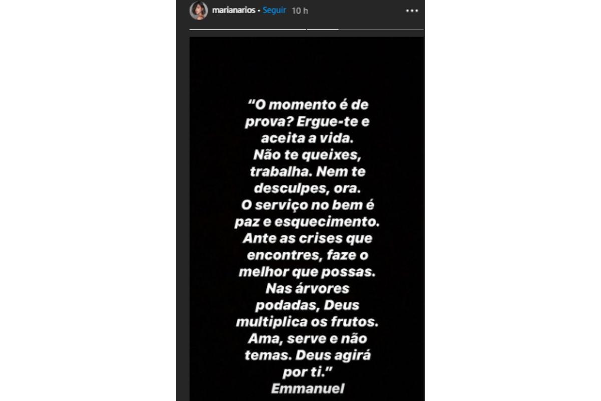 Na última quarta-feira, 15 de julho, a atriz Mariana Rios, compartilhou uma emocionante reflexão em suas redes sociais. A frase que foi escrita por Emmanuel, espírito orientador de Chico Xavier, fala sobre evolução, busca da paz e confiança nas ações de Deus. Mariana, está tentando transmitir positividade desde que sofreu um aborto espontâneo do primeiro filho, na última semana.