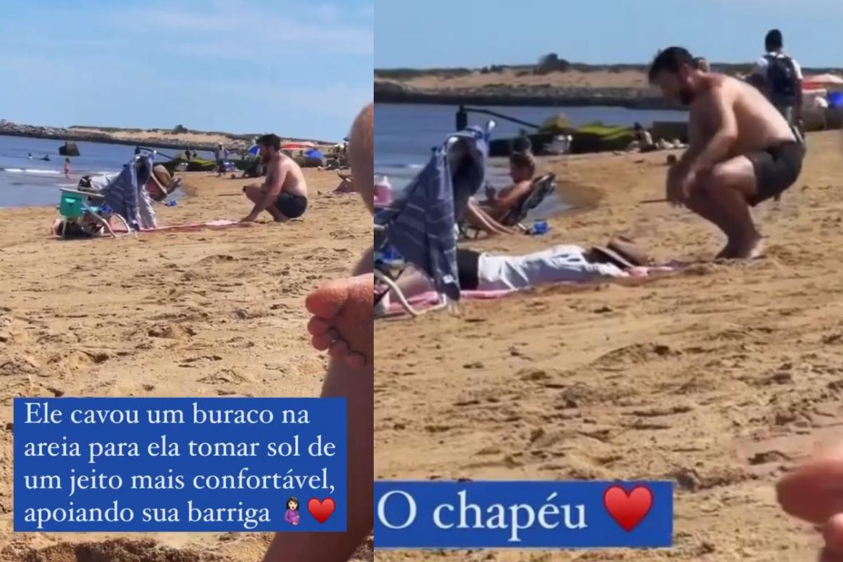 Diversos banhistas que estavam no local se comoveram com a cena e decidiram pegar os celulares e registrar o momento lindo entre marido e mulher (e filho). “Ele cavou um buraco na areia para ela tomar sol de um jeito mais confortável, apoiando sua barriga”, escreveu o responsável pelo vídeo.