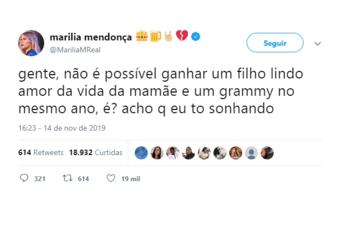 Em seu Twitter, Marília compartilhou a emoção e comparou o que sentiu ao descobrir as duas coisas: gravidez e prêmio. Pela felicidade, o Grammy com certeza será mais um filho para ela! Na rede social, ela escreveu: “Gente, não é possível ganhar um filho lindo amor da vida da mamãe e um Grammy no mesmo ano, é? Acho que eu estou sonhando”.