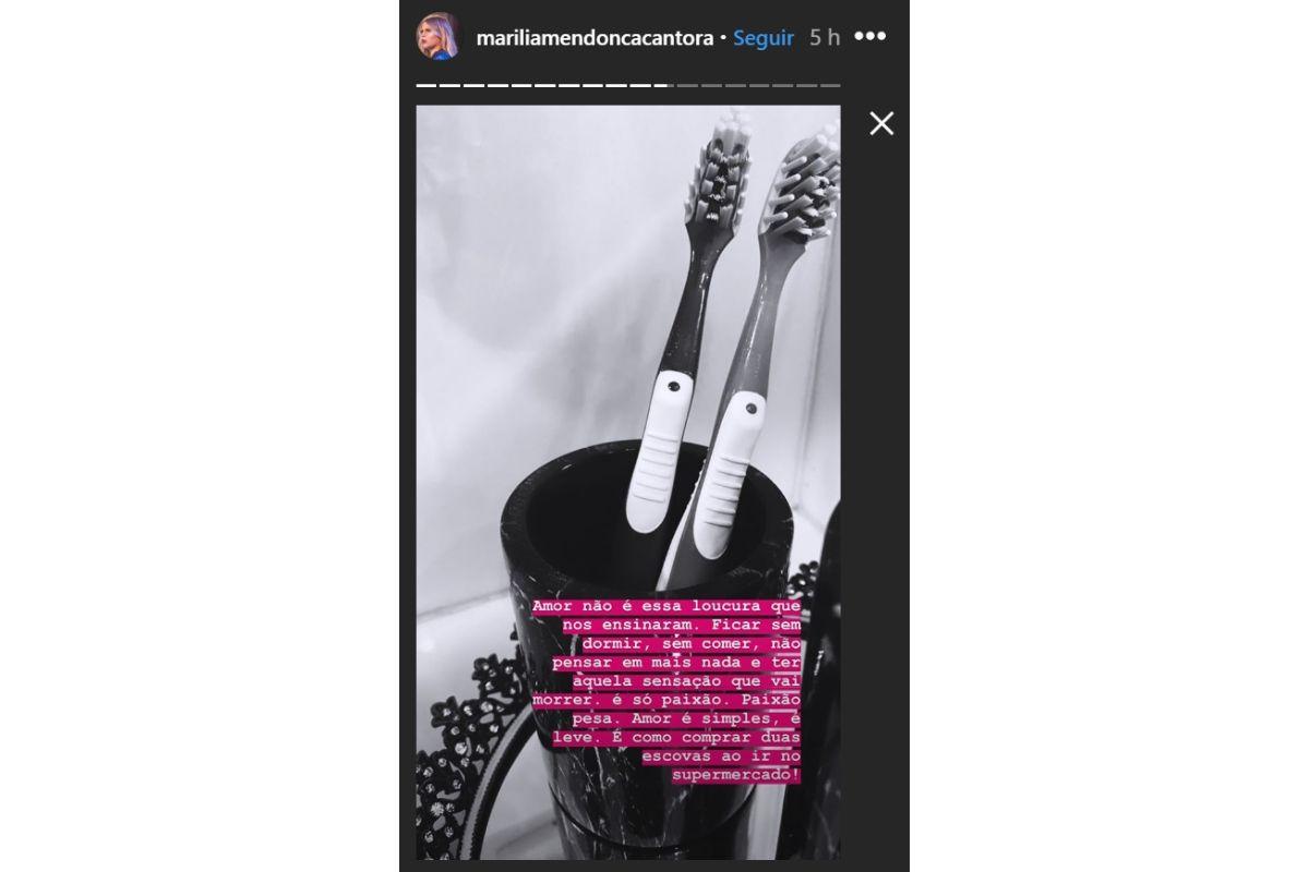 Mas não foi só isso que fez os fãs acreditarem que ela e namorado estão “juntando os trapos”. Marília também escreveu um texto sobre o assunto. Olha só: “Amor não é essa loucura que nos ensinaram. Ficar sem dormir, sem comer, não pensar em mais nada e ter aquela sensação que vai morrer. É só paixão. Paixão pesa. Amor é simples e leve. É como comprar duas escovas ao ir no supermercado”.