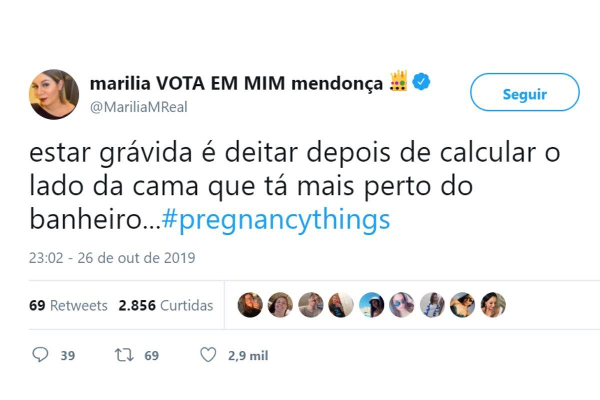 Marília ainda brincou com a vontade que as mulheres grávidas sentem em fazer xixi. Principalmente durante a noite. “Estar grávida é deitar depois de calcular o lado da cama que tá mais perto do banheiro… #pregnancythings”, disse no Twitter.