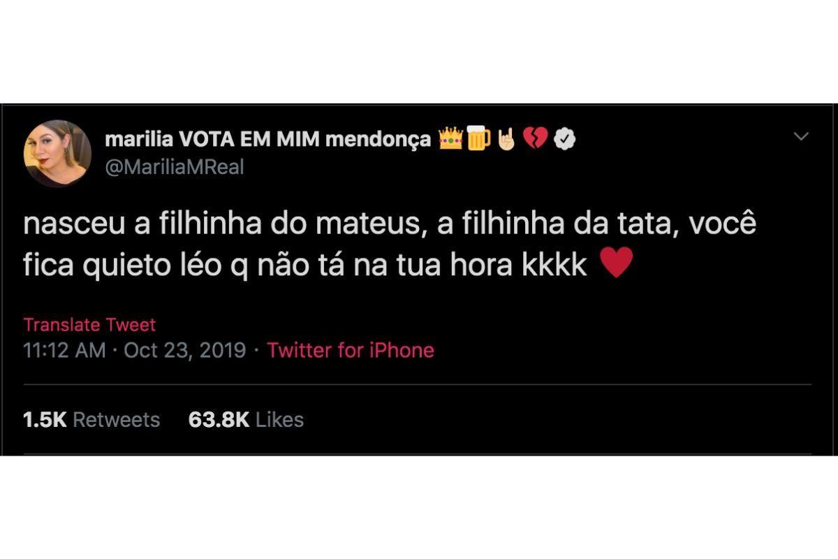 “Nasceu a filhinha do Mateus, a filhinha da Tata, você fica quieto Léo q não tá na tua hora kkkk”, brincou a cantora em publicação. Vale lembrar que Leo é o primeiro filho de Marília com o músico Murilo Huff.