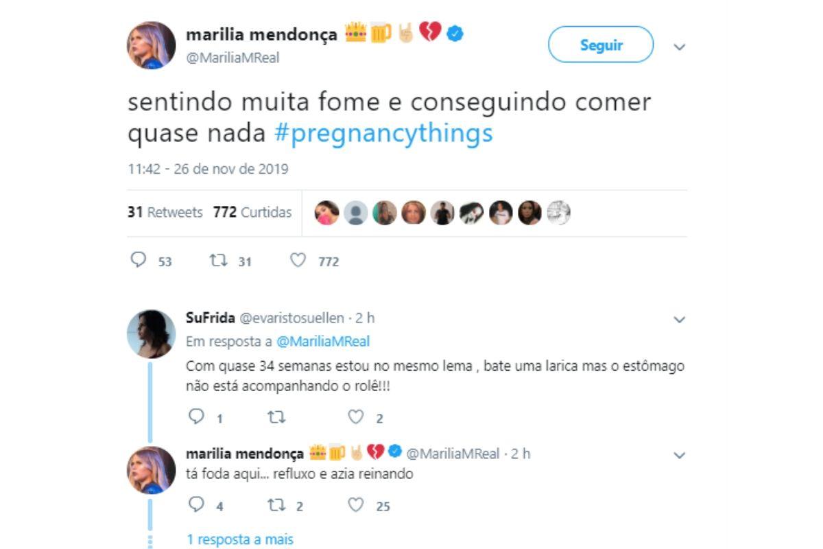 Apesar da felicidade da maternidade, toda a semana a cantora compartilha um novo desafio. Desta vez, ela contou em sua conta do Twitter nesta terça-feira, 26 de novembro, que está sofrendo com refluxo. “Estou sentindo muita fome e não conseguindo comer quase nada. Tá complicado aqui… refluxo e azia reinando”, escreveu Marília em resposta à um fã.