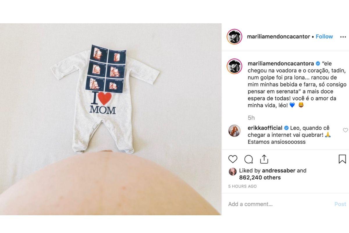 Na publicação, a mãe de primeira viagem aparece mostrando apenas a barriga em frente ao exame de ultrassom e um body com o bordado “Eu amo a mamãe. “Ele chegou na voadora e o coração, tadin, num golpe foi pra lona… rancou de mim minhas bebida e farra, só consigo pensar em serenata” a mais doce espera de todas! você é o amor da minha vida, Léo!”, escreveu em legenda.