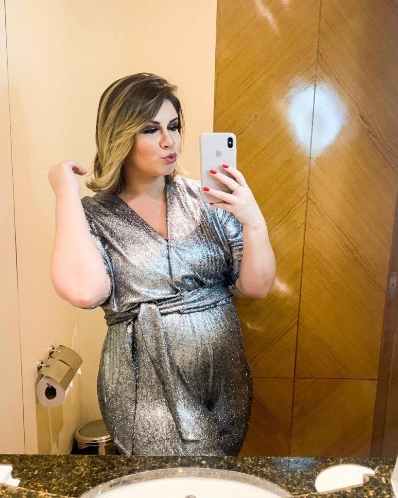 A cantora postou uma foto exibindo sua barriguinha de grávida com um look prata e escreveu: “Todo mundo já vê que eu não ando sozinha…”. O filho que se chamará Léo, é fruto do namoro com o cantor Murilo Huff.