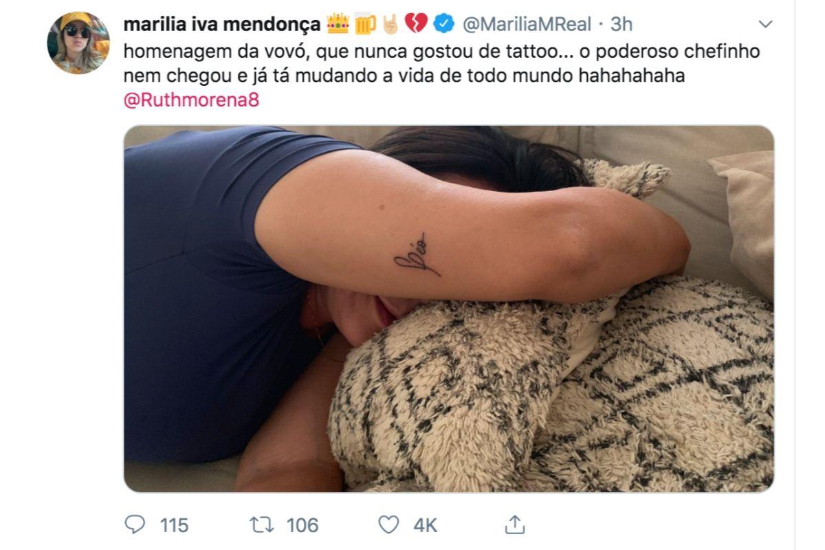 “Homenagem da vovó, que nunca gostou de tattoo.. o poderoso chefinho nem chegou e já tá mudando a vida de todo mundo hahahahaha”, escreveu Marília em legenda.