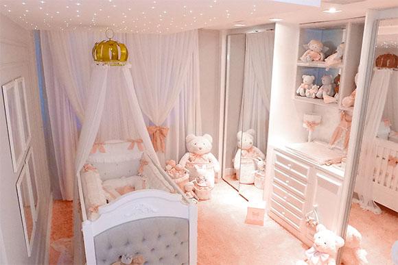 O casal abriu as portas do seu apartamento no Rio de Janeiro (RJ) e mostrou detalhes do quarto da bebê. A empresa Grão de Gente, contou que os pais escolheram a Coleção Princesa Clássica da marca para criar um ambiente sofisticado e aconchegante. Todo o enxoval está repleto de bordados delicados, rendas, laços e babados.