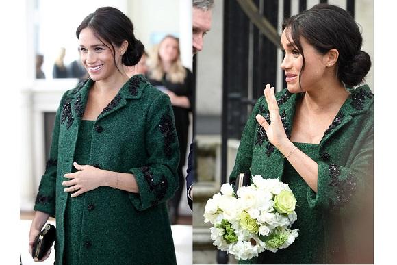 Meghan está na reta final da gravidez e chamou atenção por aparecer no evento sem a sua aliança de casamento, feita com diamantes de joias que pertenceram à princesa Diana.