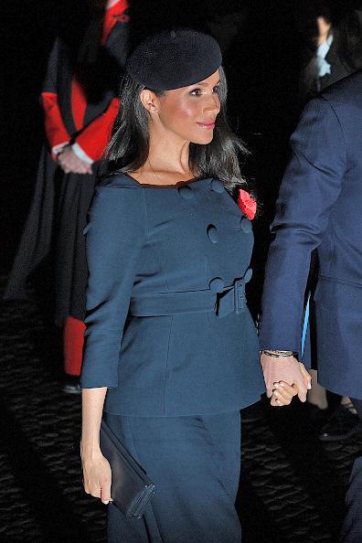 A celebração foi feita pelos 100 anos do fim da Primeira Guerra Mundial e Meghan escolheu ir com um vestido azul marinho, com um cinto na cintura que marca sua barriga. O valor da roupa não foi divulgada, mas só os sapatos dela, que eram na mesma cor, custaram cerca de 2 mil reais, segundo o jornal britânico Daily Mail.