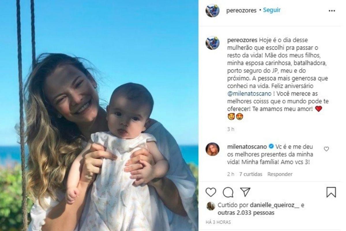 A celebração ocorreu no último sábado, 9 de janeiro. Durante a madrugada de domingo, 10, amigos publicaram imagens de Milena com um sticker de “It’s a boy” (é um menino). Na manhã desta segunda, o marido se declarou: “Hoje é o dia desse mulherão que escolhi pra passar o resto da vida! Mãe dos meus filhos, minha esposa carinhosa, batalhadora, porto seguro do JP, meu e do próximo. A pessoa mais generosa que conheci na vida. Feliz aniversário”, postou.