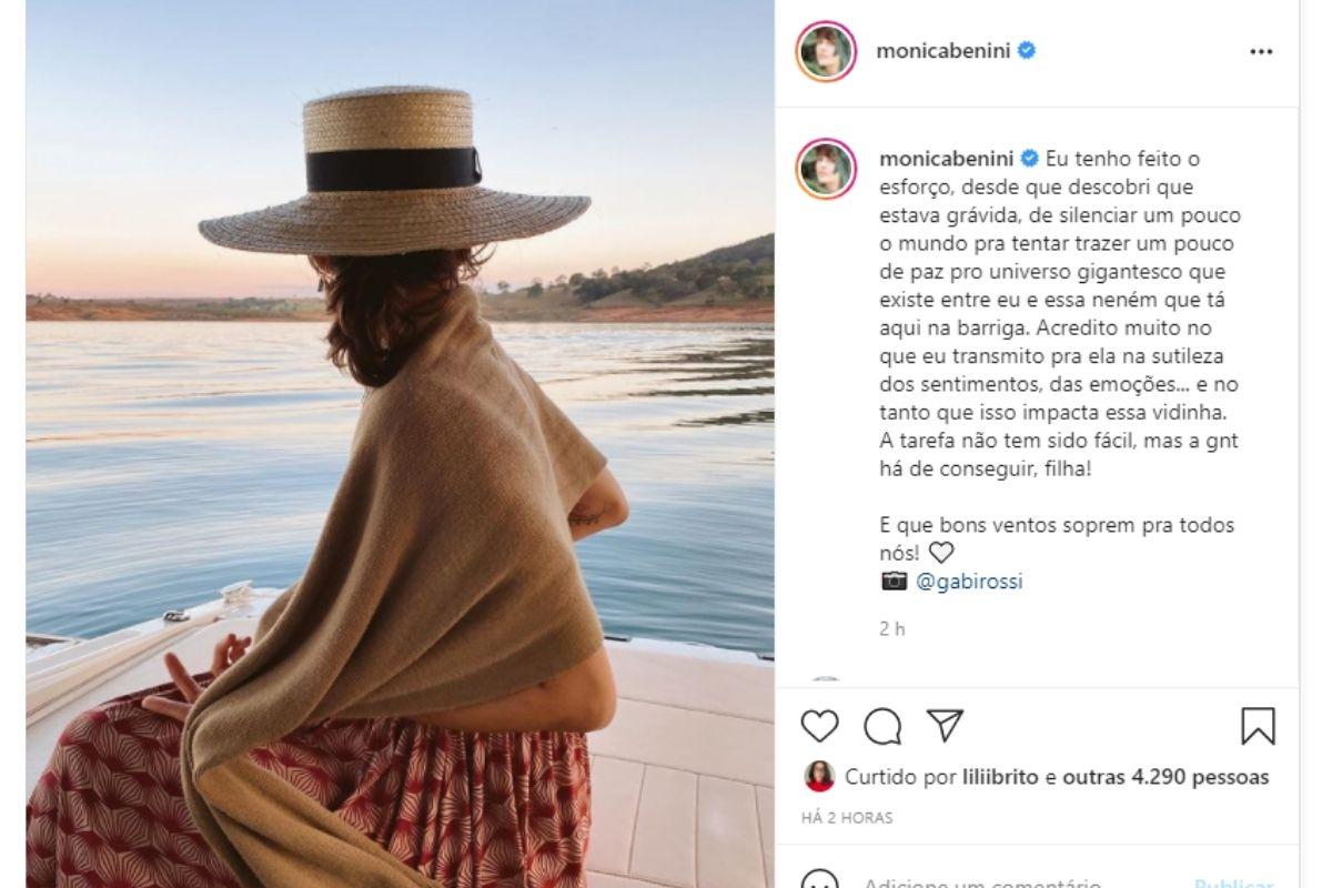 “Eu tenho feito o esforço, desde que descobri que estava grávida, de silenciar um pouco o mundo pra tentar trazer um pouco de paz pro universo gigantesco que existe entre eu e essa neném que tá aqui na barriga. Acredito muito no que eu transmito pra ela na sutileza dos sentimentos, das emoções… e no tanto que isso impacta essa vidinha. A tarefa não tem sido fácil, mas a gente há de conseguir, filha! E que bons ventos soprem pra todos nós!”, escreveu Monica ao compartilhar uma foto em que aparece em um barco.