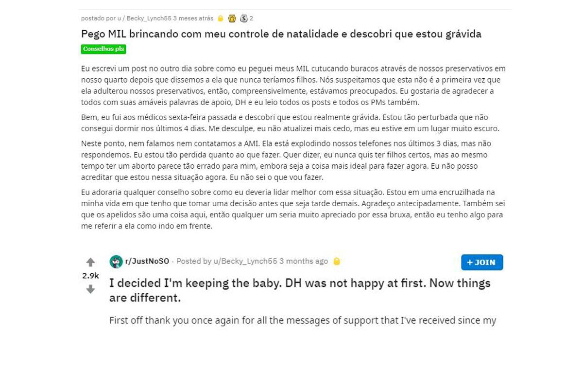 Mas depois de um tempo ela disse que vai manter a gravidez. “Meu marido estava claramente descontente com minha decisão, mas está disposto a aceitá-la. Eu não quero abortar nem quero dar este bebê para adoção. Eu decidi que quero 100% ter esse bebê e criá-lo. Depois, ele me disse que sinceramente quer ter esse filho comigo, ser seu pai e estar lá com a gente”, disse para encerrar a série de posts no Reddit.