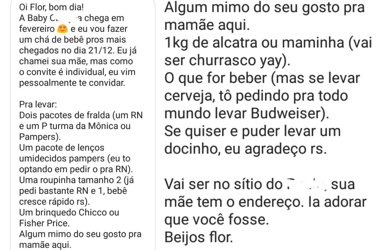 Ufa, é uma lista de presentes e tanto! Os internautas não deixaram passar foram diversos comentários sobre esse pedido nada comum. Em uma postagem aparece a anfitriã triste porque um convidado não vai, afinal “ela já contava com as coisinhas”.
