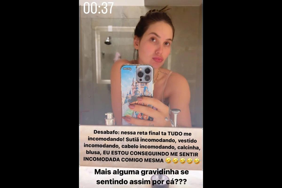 Por meio dos stories do Instagram oficial, ela publicou uma foto no espelho e contou que está se sentindo muitos incomodada nessas últimas semanas da gestação. Segundo a influenciadora, ela se incomoda com ela mesma e com tudo o que usa. “Desabafo: Nessa reta final tudo está me incomodando! Sutiã incomodando, vestido incomodando, cabelo incomodando, calcinha, blusa. Eu estou conseguindo me sentir incomodada comigo mesma”, relatou. E ainda perguntou se alguma de suas seguidoras também está passando pelo mesmo: “Mais alguma gravidinha se sentindo assim por cá?”