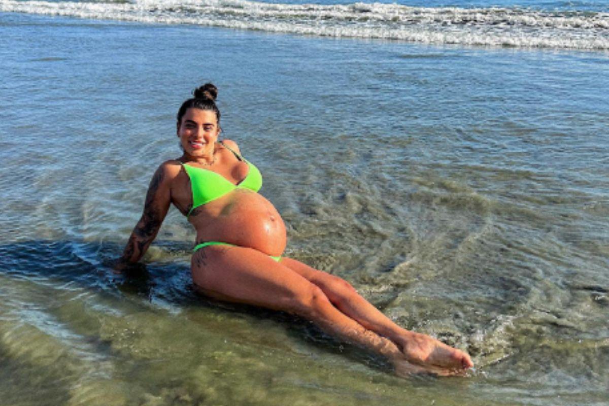 Em uma sequência de fotos a futura mãe surge em um cenário paradisíaco, deitada no mar com os pés esticados e usando um biquíni verde-limão. “Cresce e cresce”, ela escreveu na legenda da publicação no Instagram.