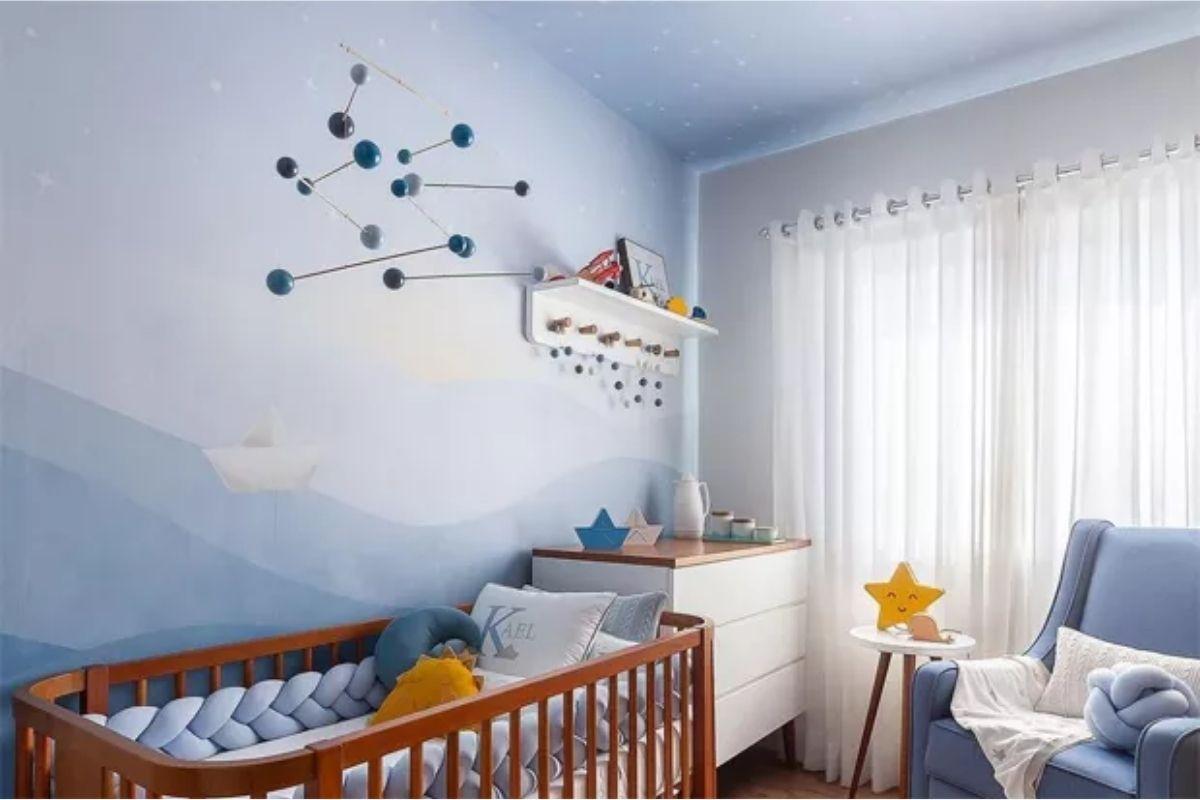 O quarto possui uma temática de barco, e uma decoração discreta e muito linda. As paredes são pintadas com uma sobreposição de tons de azul, com um desenho de um barco. Além disso, o berço e os móveis são em madeira e muito elegantes!
