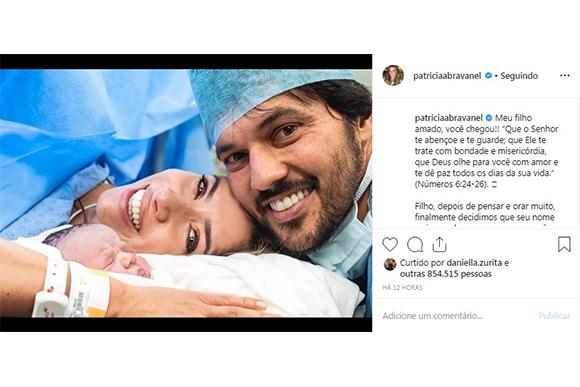 “Meu filho amado, você chegou!! ‘Que o Senhor te abençoe e te guarde; que Ele te trate com bondade e misericórdia, que Deus olhe para você com amor e te dê paz todos os dias da sua vida’ (Números 6:24-26)”, escreveu a mãe na legenda da primeira foto da criança com os pais. A publicação teve mais de 800 mil curtidas no Instagram de Patrícia, que conta com quase 7 milhões de seguidores.