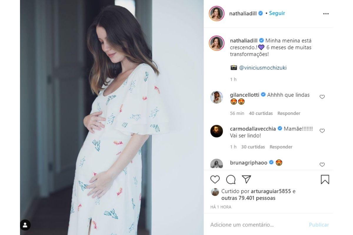 Nesta quinta-feira, 10 de setembro, Nathalia Dill mostrou como cresceu a barriga de gravida. A atriz, que espera uma menina, celebrou os seis meses de gestação. “Minha menina está crescendo! Seis meses de muitas transformações”, escreveu na legenda da foto feita pelo fotógrafo Vinicius Mochizuki.