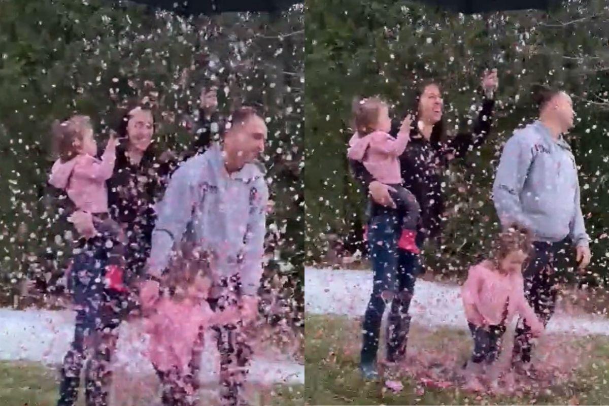 A revelação foi feita com pequenos pedaços de papel colorido picados e colocados dentro de um guarda chuva. O pai, ao ver o cor-de-rosa cair, não celebrou: apenas saiu de perto e deixou clara a insatisfação dele após aparecer reclamando no vídeo.