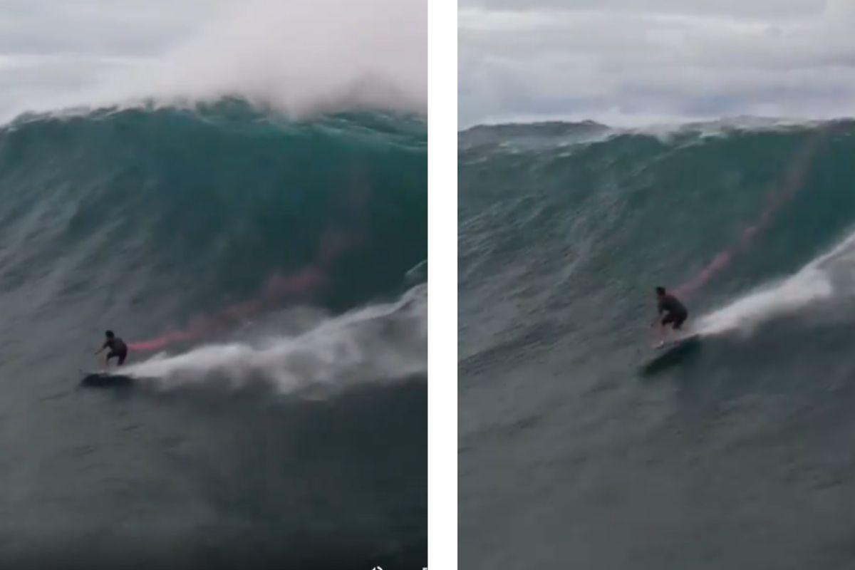 Mais adiante, uma câmera grava de longe a movimentação do pai com o sinalizador – e é possível perceber ainda a imensidão da onda que Kai está surfando. Uau! Na legenda, ele ainda comemorou com seguidores, “Serei um pai de meninas!”.