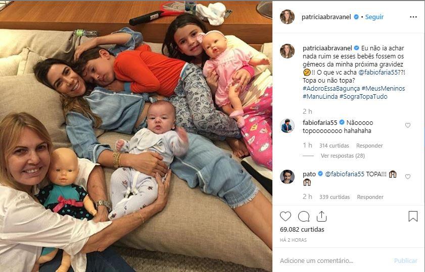 No sofá de casa, Patrícia posou ao lado dos filhos Pedro, de 4 anos, e Senor, de 3 meses, e duas bonecas. Na legenda, a apresentadora disse: “Eu não ia achar nada ruim se esses bebês fossem os gêmeos da minha próxima gravidez. O que você acha, Fábio Faria? Topa ou não topa?”, ela perguntou ao marido.