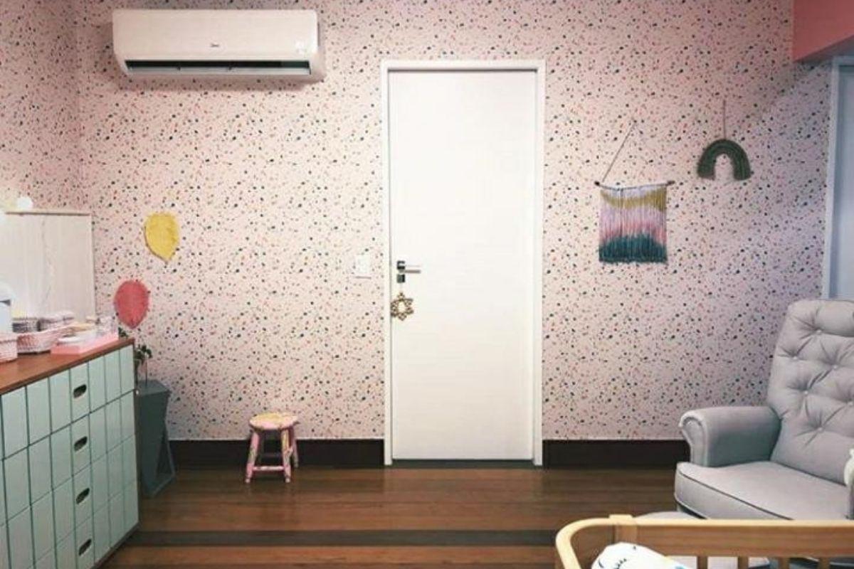 Ela está no 9º mês da gestação e compartilhou algumas fotos mostrando uma parede rosa e outra toda com bolinhas coloridas, um berço de madeira, tapete colorido e detalhes do cômodo, como itens pendurados nas paredes e um banquinho todo com desenhos de bananas.