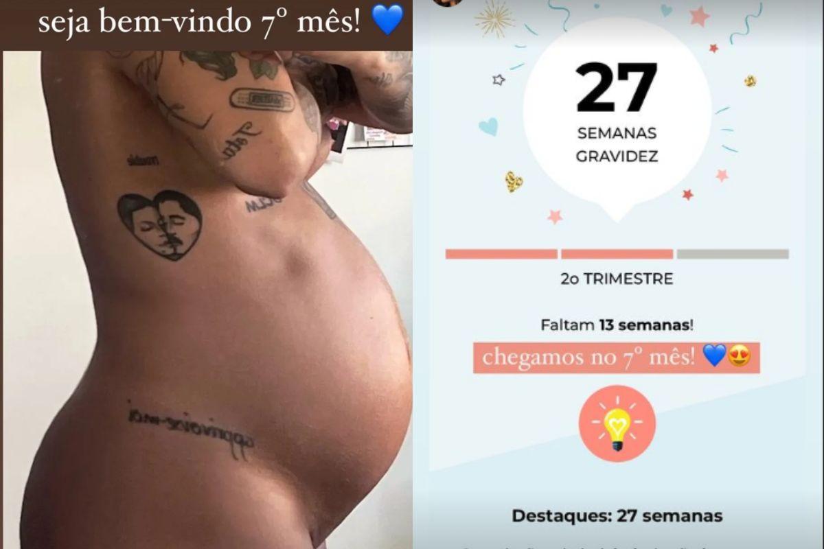 Nos Stories do Instagram, Petracompartilhou um print de uma aplicativo de gravidez que apontava que ela está na semana 27. Logo em seguida ela mostrou uma foto da barriga para mostrar a evolução da gestação e escreveu: “Seja bem-vindo 7º mês”.