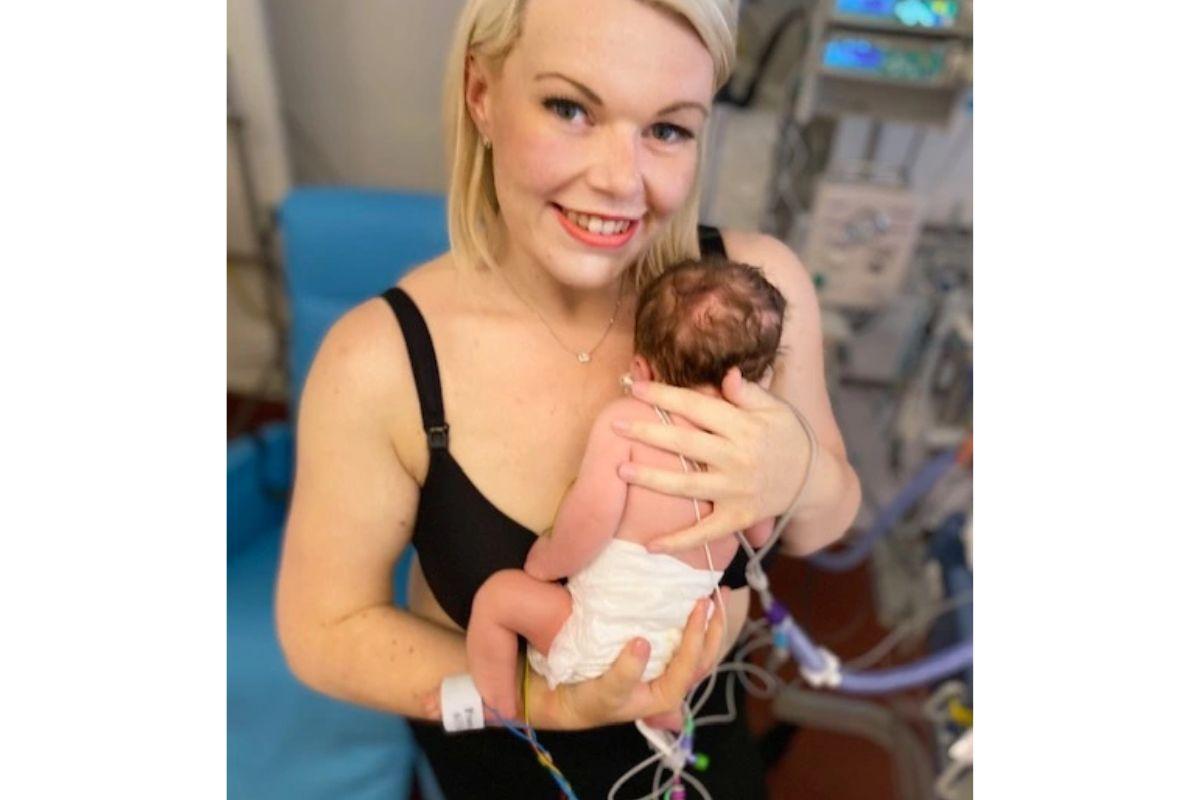 Dominic, que havia corrido de volta para casa para ficar com ela, chamou uma ambulância, esperando que o trabalho de parto durasse várias horas. Mas depois de apenas três empurrões, seu bebê surpresa – que eles chamaram de Evelyn – “saiu”.Tendo sido privada de oxigênio por um período considerável de tempo, Evelyn estava flácida e tinha a pele azulada.