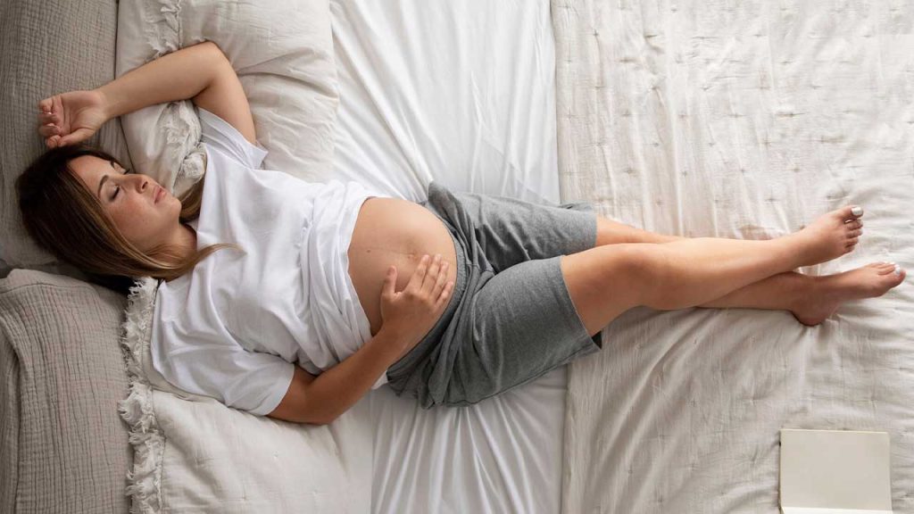 • Deitar de lado: A posição lateral (de lado) melhora o fluxo sanguíneo e a oxigenação para o feto, além de reduzir a pressão sobre a coluna e os órgãos. Colocar uma almofada entre as pernas pode ajudar a aumentar o conforto.