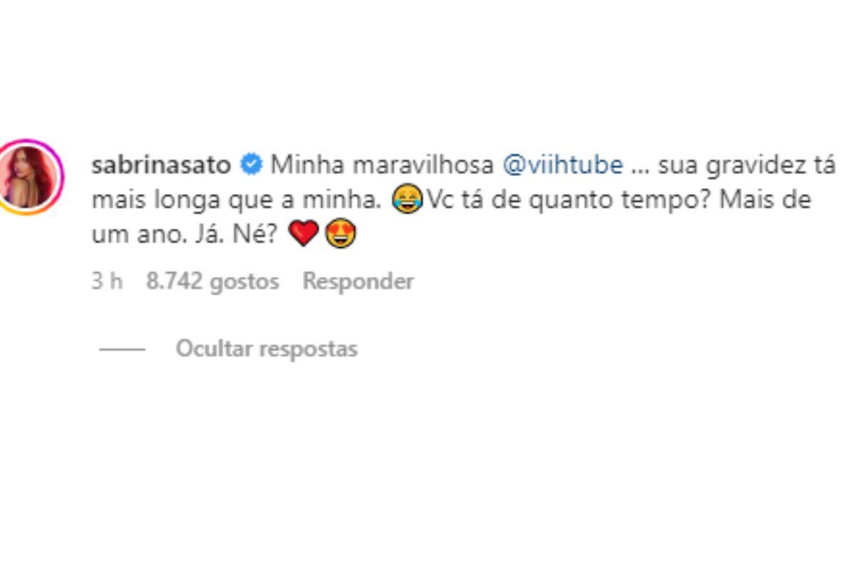 A apresentadora Sabrina Sato relembrou que na primeira gravidez, a filha Zoe também demorou para nascer. ‘’Minha maravilhosa Viih Tube … sua gravidez tá mais longa que a minha. Vc tá de quanto tempo? Mais de um ano. Já. Né?’’, brincou a mãe nos comentários da publicação da influenciadora.