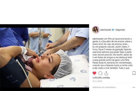 Na última quarta-feira, Sabrina publicou um texto emocionante sobre seu trabalho de parto: “Um filho já nasce ensinando a gente. E a Zoe além de me ensinar sobre o maior amor da vida, me ensinou mais…Eu me preparei, estudei, assisti vídeos, li livros, fiquei 5 meses da gestação fazendo exercícios pélvicos pra poder fazer o parto mais natural possível. Me recolhi, deixei de ir em festas de amigos e me dediquei total a esse grande sonho de gerar uma filha. Passei essas 41 semanas em concentração, vivendo isso e fazendo todos a minha volta e até vocês a viver também. Tudo o que me proponho a fazer na vida, faço com toda minha força, trabalho, amor e fé, por isso, sempre tudo saiu da forma que mentalizava, imaginava e queria. Mas Deus está sempre nos ensinando. E às vezes o que queremos não vem no caminho que imaginamos, da forma que gostaríamos.