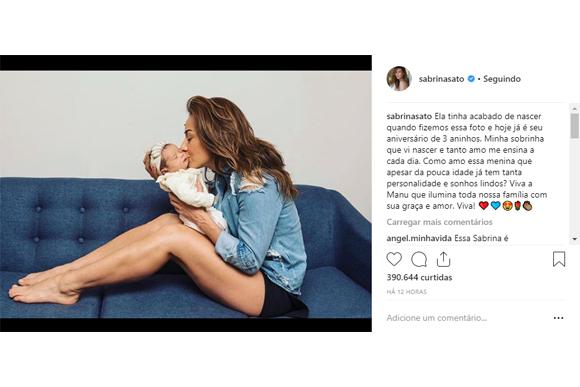 Os internautas imediatamente deram parabéns à Sabrina desejaram saúde ao bebê, pensando que ela já tinha dado à luz sua filha. Mas na legenda da foto, ela explicou que se trata da sobrinha Manu, filha de sua irmã Karina Sato, que acabou de completar 3 anos. “Ela tinha acabado de nascer quando fizemos essa foto e hoje já é seu aniversário de 3 aninhos. Minha sobrinha que vi nascer e tanto amo me ensina a cada dia. Como amo essa menina que apesar da pouca idade já tem tanta personalidade e sonhos lindos? Viva a Manu que ilumina toda nossa família com sua graça e amor. Viva!”, escreveu Sabrina.
