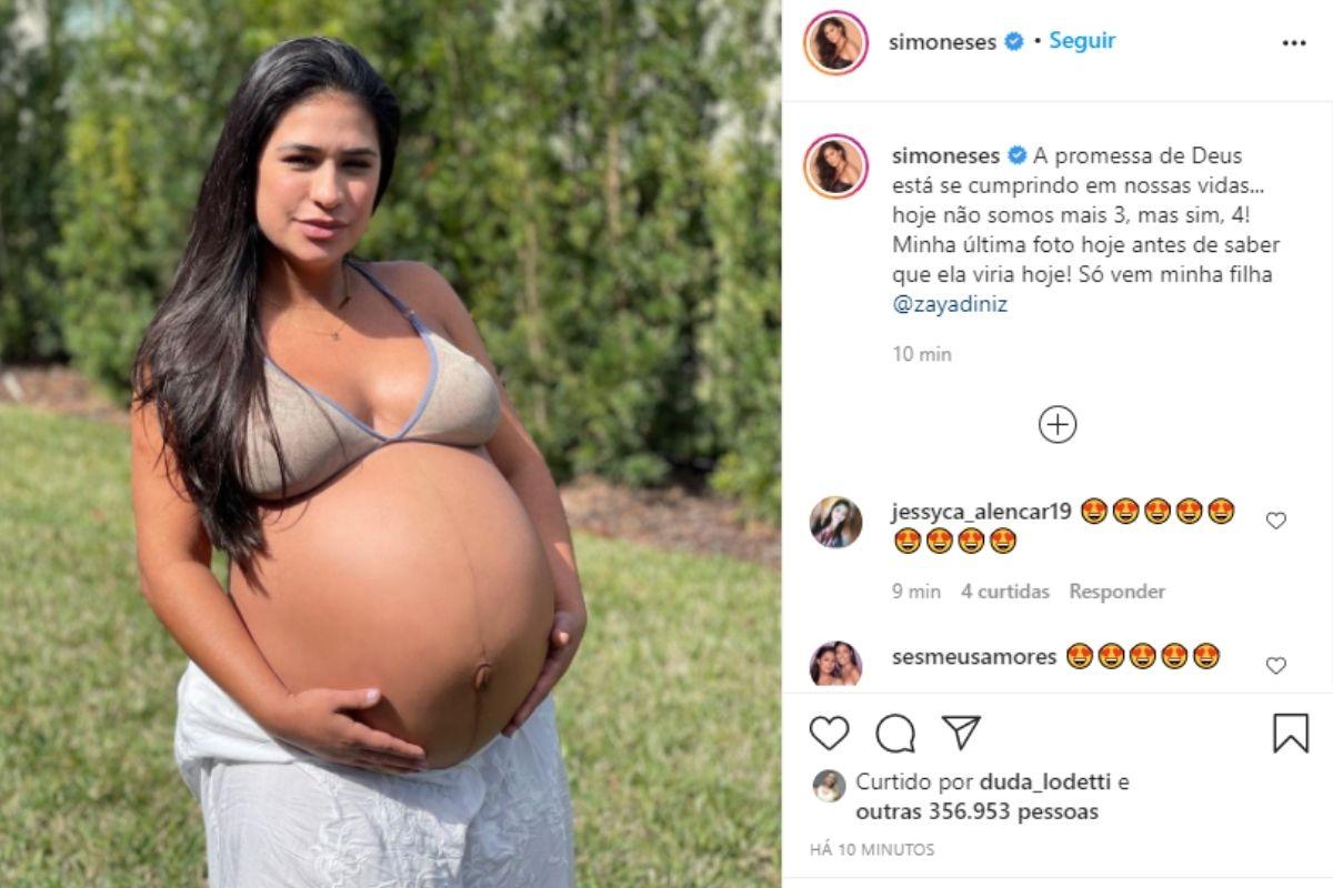 Simone acaba de publicar nas redes sociais que a filha, Zaya, nascerá nesta segunda-feira, 22 de fevereiro. A dupla de Simaria compartilhou a última foto grávida e informou aos seguidores que o parto da segunda filha com Kaká Diniz está prestes a acontecer. “A promessa de Deus está se cumprindo em nossas vidas… hoje não somos mais 3, mas sim, 4! Minha última foto hoje antes de saber que ela viria hoje! Só vem minha filha”, escreveu a sertaneja na publicação.