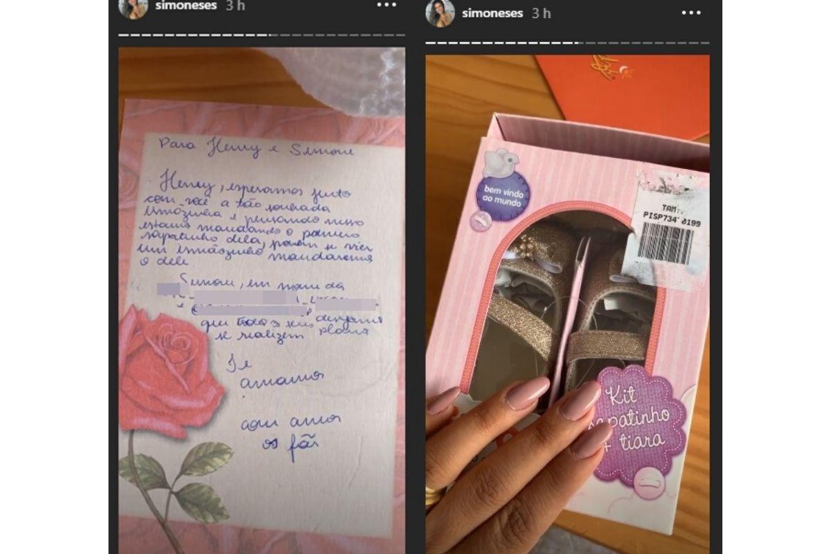 Durante um show, Simone, da dupla com Simaria, ganhou um presente bastante inesperado dos fãs enquanto ainda estava no camarim. Depois de receber um sapatinho de bebê, e mostrar pelos stories, a cantora, que é mãe de Henry, de cinco anos, abriu o jogo sobre o segundo filho.