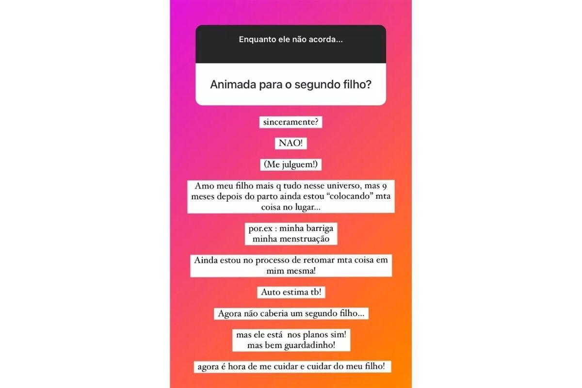 “Sinceramente? Não! Me julguem”, iniciou ela, em resposta ao questionamento de um fã. “Amo meu filho mais do que tudo nesse universo, mas 9 meses depois do parto eu ainda estou ‘colocando’ muita coisa no lugar… Por exemplo: Minha barriga, minha menstruação. Ainda estou no processo de retomar muita coisa em mim mesma! Auto estima também! Agora não caberia um segundo filho”, admitiu.