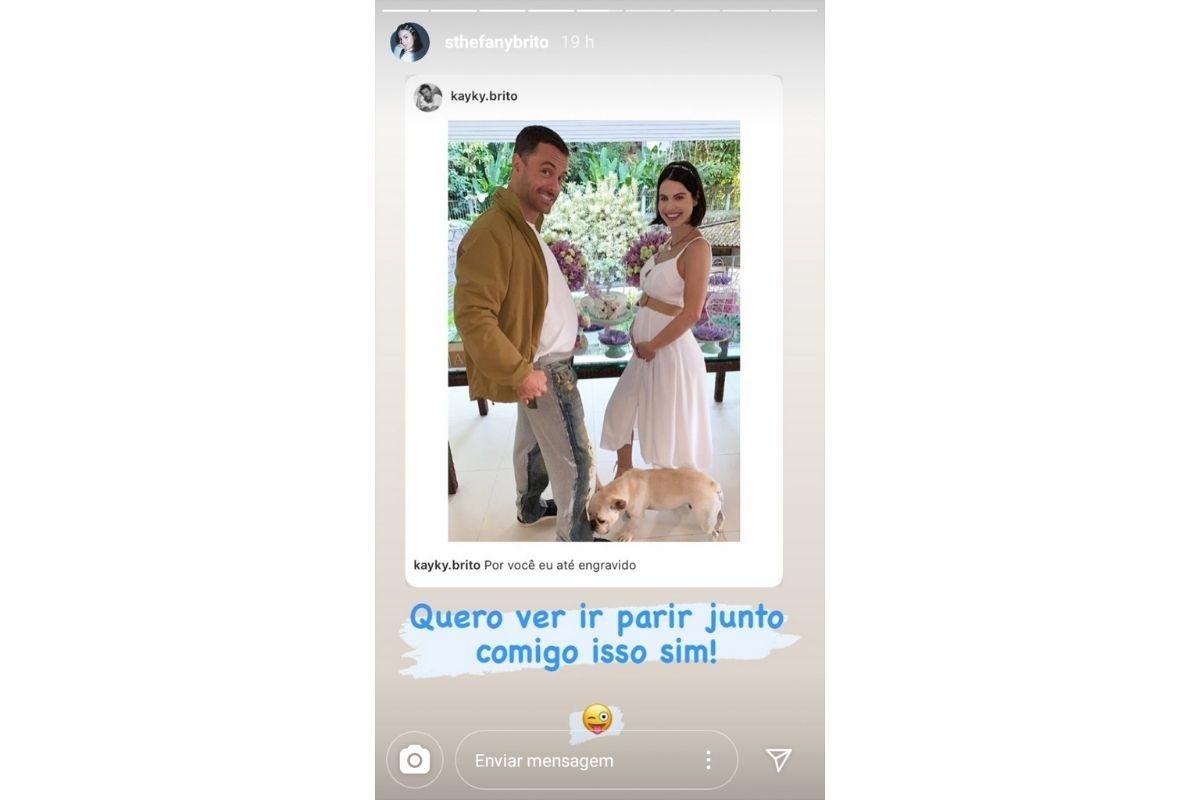 Na última quarta-feira, 5 de agosto, Kayky Brito, irmão de Sthefany Brito, compartilhou uma foto nas redes sociais inchando a barriga para “imitar” a atriz, que está esperando pelo primeiro filho. Em uma brincadeira, ela repostou a publicação nos stories e mandou um recado para ele.