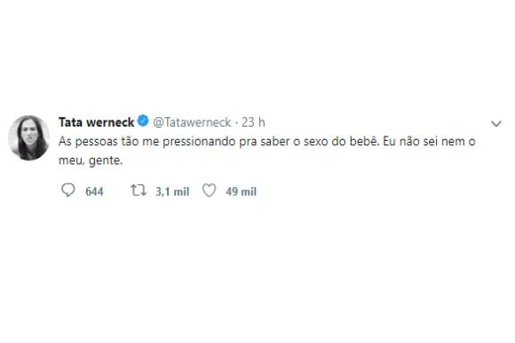 Desta vez, em seu Twitter, Tata desabafou sobre a cobrança que tem recebido do público para saber se espera uma menina ou um menino. Mais uma vez com muito carisma, a apresentadora escreveu: “As pessoas tão me pressionando para saber o sexo do bebê. Eu não sei nem o meu, gente”.