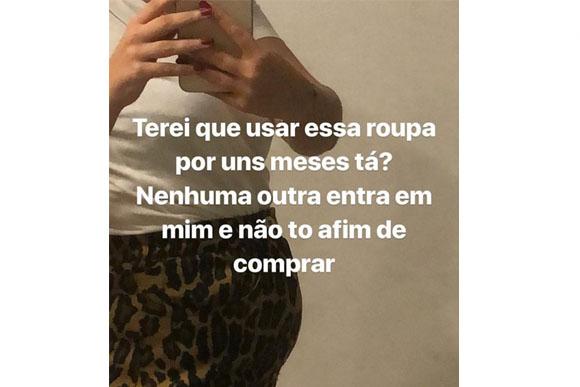 A atriz postou usou a ferramenta dos stories para compartilhar como estava sua barriga e fez piada com o fato das roupas não estarem mais servindo: “Terei que usar essa por uns meses, tá? Nenhuma outra entre em mim e não estou afim de comprar”. Olha só: