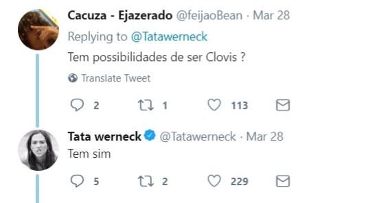 Tatá Werneck está esperando primeiro filho com o ator da globo Rafael Vitti. Na última quinta-feira, dia 28 de março, a humorista respondeu o comentário de um seguidor no Twitter sobre o nome do bebê. “Tem a possibilidade de ser Clovis”, escreveu o fã. “Tem sim”, respondeu Tatá. E é claro que já surgiram vários memes com essa informação.
