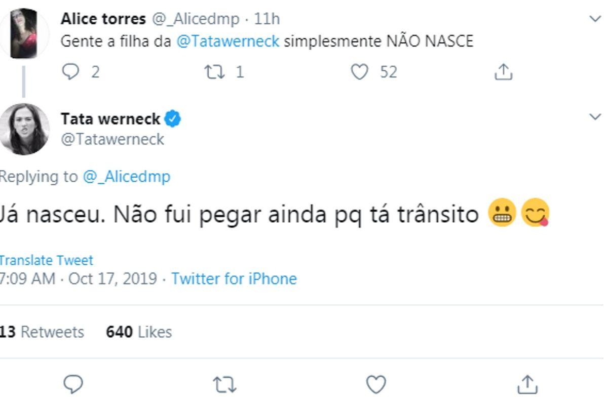 No Twitter, Tatá deu um susto nos seguidores ao responder uma usuária. “Gente, a filha da Tatá Werneck simplesmente NÃO NASCE”, disse a seguidora. Tatá, sem perder o sarcasmo e a piada, prontamente respondeu para a fã. “Já nasceu. Não fui pegar ainda porque tá trânsito”, disse a atriz.