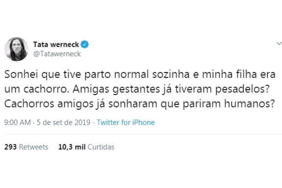 A futura mãe sonhou que o parto da menina foi normal e ela era um cachorro! ”Sonhei que tive parto normal sozinha e minha filha era um cachorro. Amigas gestantes já tiveram pesadelos? Cachorros amigos já sonharam que pariram humanos?”, contou Tatá em um tom de desespero bem-humorado.