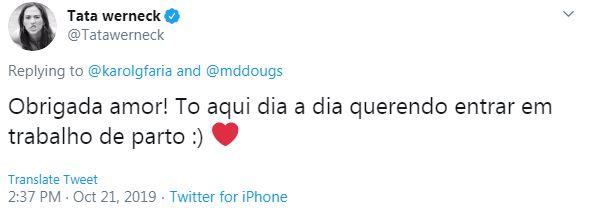 Tatá Werneck está super ansiosa para a chegada da primeira filha. Na segunda-feira, 21 de outubro, a atriz novamente tirou um tempo para responder os seguidores no Twitter e falar sobre a espera para o nascimento da filha.