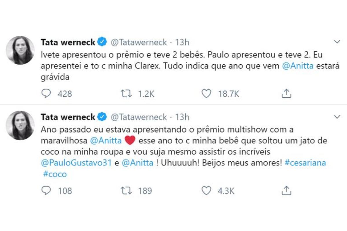 Para Tatá Werneck, Anitta será a próxima grávida entre os famosos! Na última terça-feira, 29 de outubro, aconteceu o Prêmio Multishow, uma noite para a música brasileira, e a humorista foi às redes sociais fazer uma previsão curiosa.