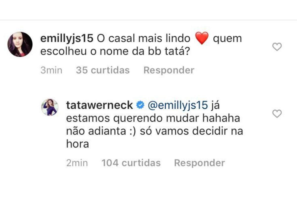 É claro que os fãs não poupariam elogios ao casal! Entre tantos comentários, uma seguidora questionou Tata sobre quem escolheu o nome do bebê e a resposta surpreendeu todos. Veja só!