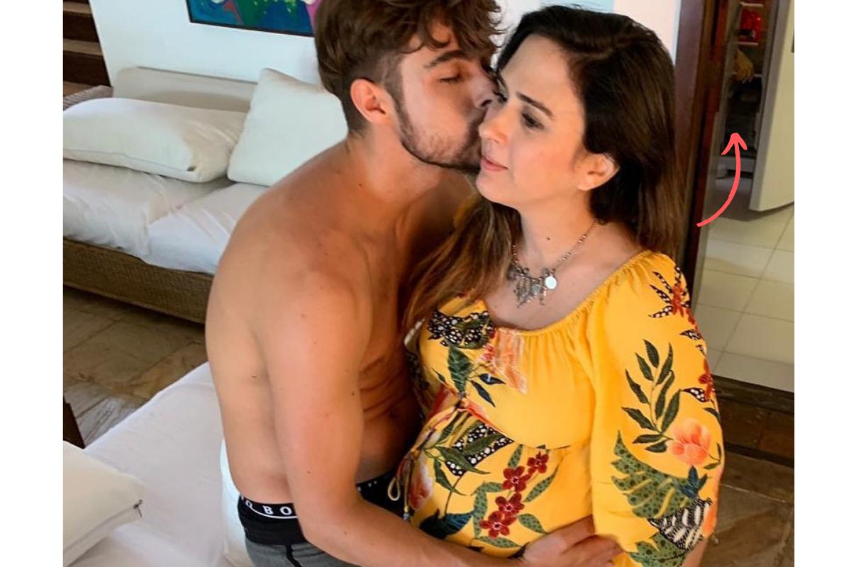 Já na segunda-feira, dia 12 de agosto, Tatá provou que as fotos ainda não tinham acabado e continuou publicando normalmente! A atriz, que já está na reta final da gravidez, até chegou a brincar com o tamanho da sua barriga. “Barriga nitidamente cenográfica”, escreveu na legenda da foto em que aparece sendo beijada pelo noivo Rafa Vitti. Apesar do casal já ser o suficiente para prender nossa atenção, um detalhe deixou muita gente incomodada!